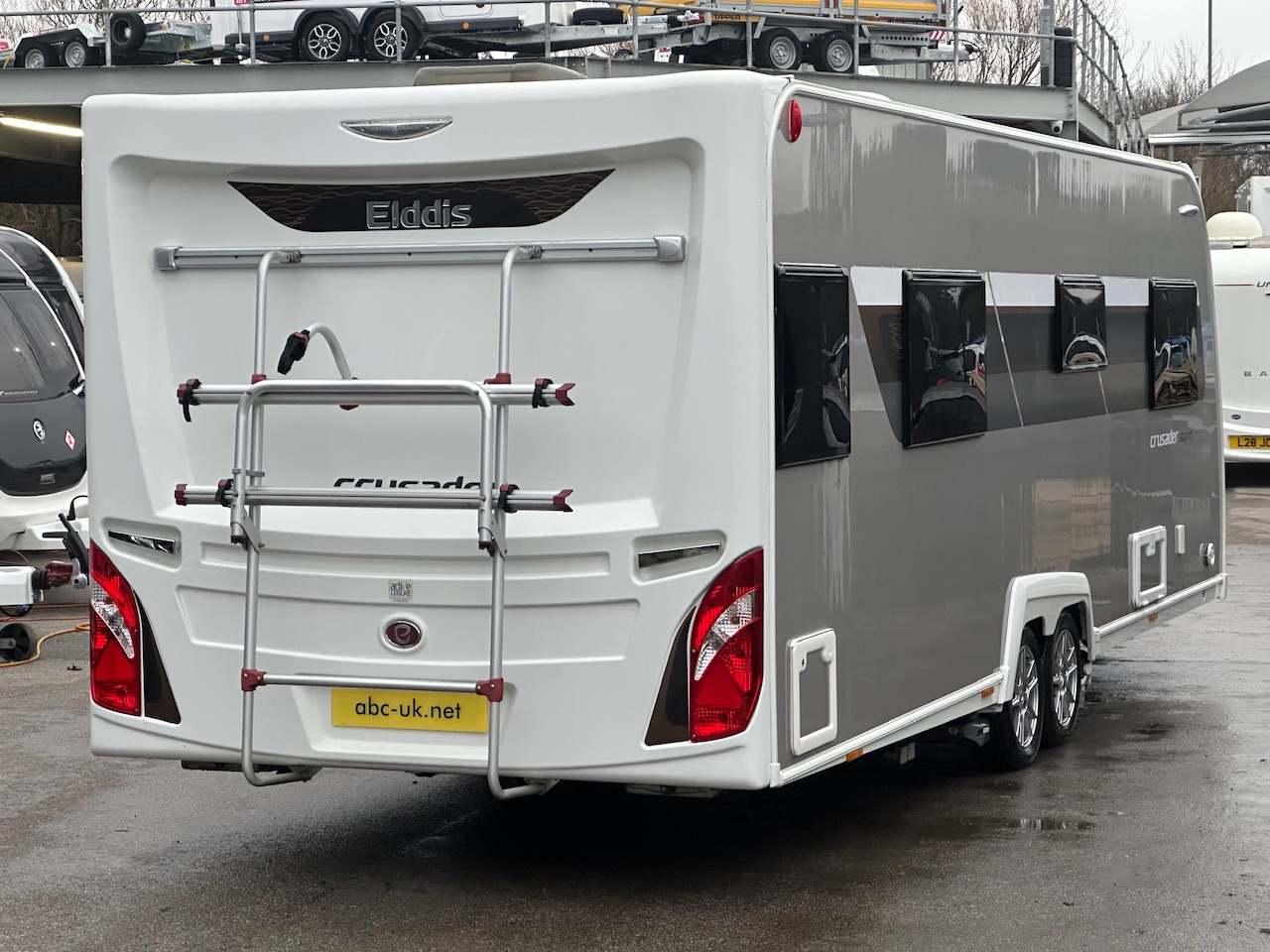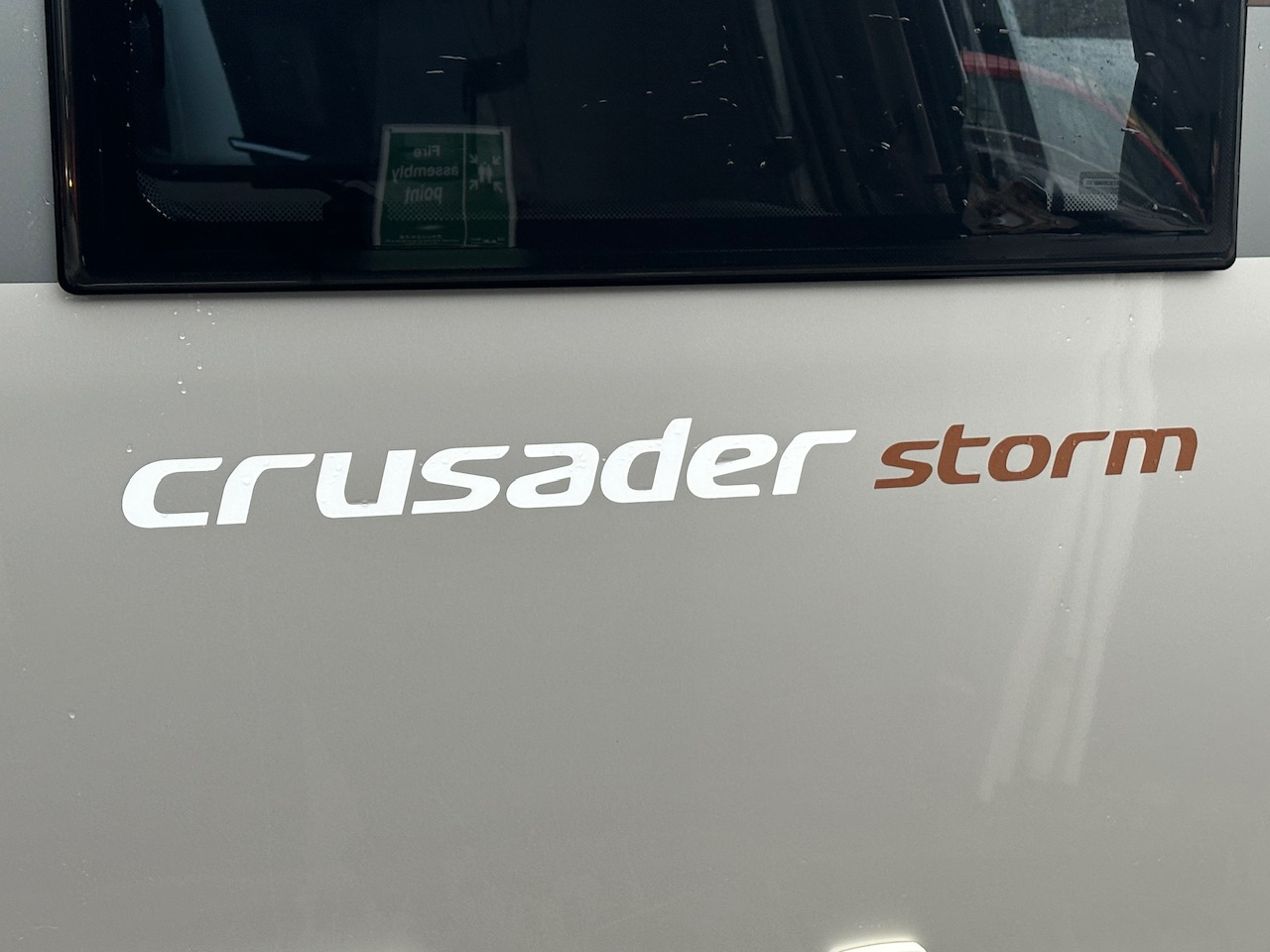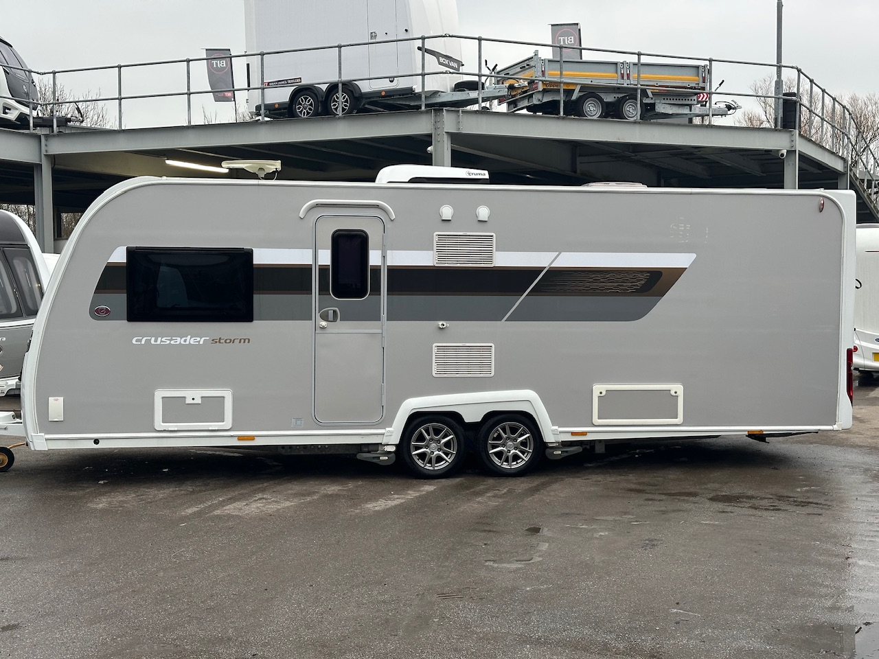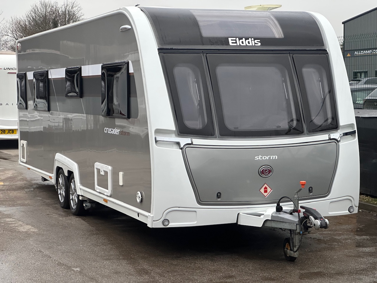 2019 Elddis Crusader Storm 4 Berth Double Axle Touring Caravan, Transverse Island Bed, End Washroom, Truma Air Conditioning, Alde Heating, Quad Motor Movers, Bike Rack Fitted, ATC, Radio, Gas Oven & Hob, Large Fridge, Microwave And Lots More. Very Clean And Tidy Example. Viewing Highly Recommended.